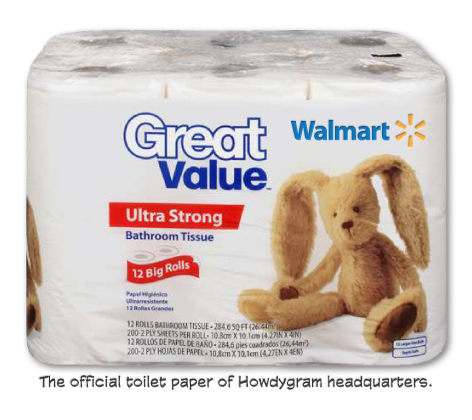 First, don’t miss this exciting, limited-time offer! Howdygramsters … let me know if you want to try a free sample of Wal-Mart’s excellent store-brand Great Value toilet paper and I’ll send you a nice, unused piece to enjoy in the privacy of your own home!